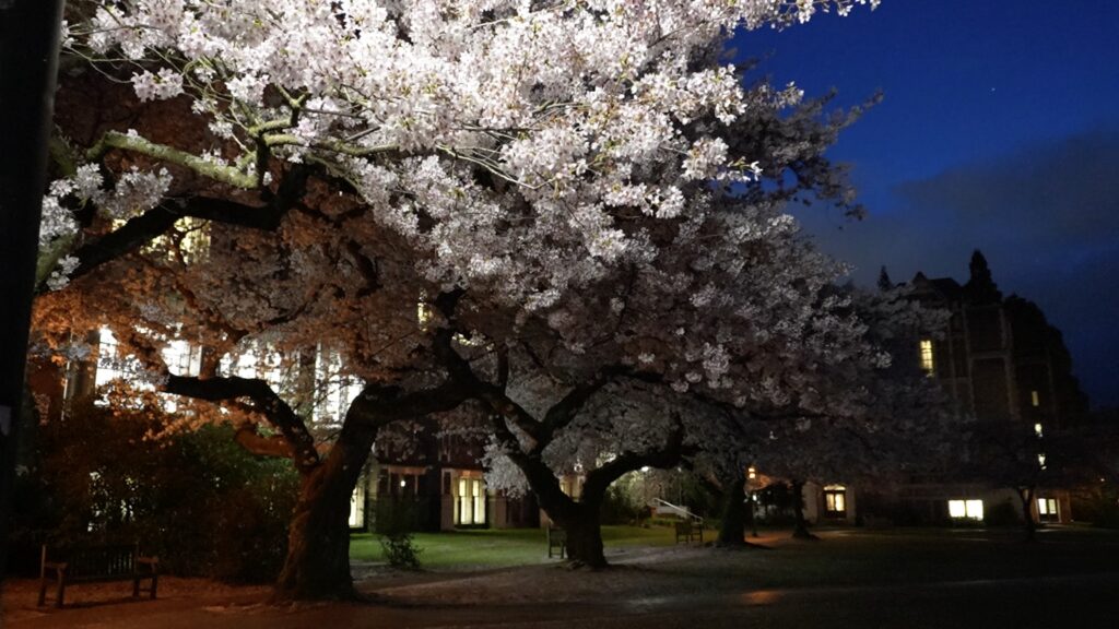 Here is a picture I took while spending time with my family enjoying Seattle’s breathtaking Yoshino cherry trees. These attractions, around 90 years old, fill the University of Washington’s Quad. Blossoms rain petals with each breeze. Everyone loves admiring the trees as sunlight sparkles through their branches. Dusk is my favorite time to take in these sights. Then a vibrant blue sky offsets the clusters of blossoms.
